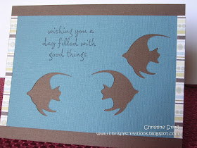 I was going to use just 2 fish and add them centered over the ribbon, but it looked too wonky to me. So when I moved them off to the corner, I realized I could use them as the banner instead. Brilliant! I cut another fish out, used some foam squares on the back of them, and ta-da: fish banner! The fish and star fish were all die cut using my Slice machine and the Under the Sea cartridge. I masked the w in wishes and stamped an 'f'....very badly! Ugh! I despise when I do that! (and that was my second attempt too! I'll blame it on it being late last night when I was working on this card, and I was tired. Yeah, that will work! LOL!) Then, when looking at the scrap of blue I cut the fishes out of, I thought that would look cool on the inside of the card! (brilliant idea #2! LOL!)